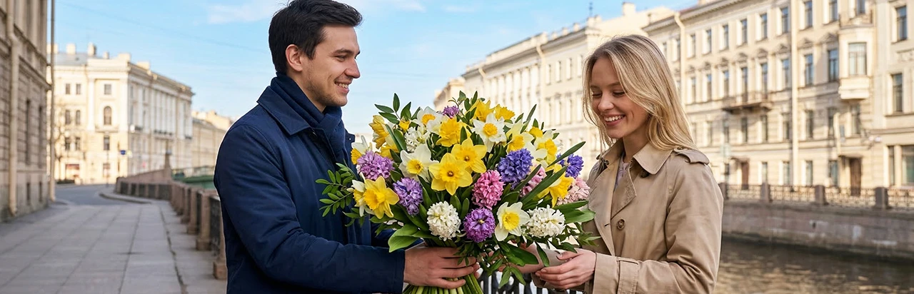 Апрельские букеты выглядят иначе, чем летние или осенние. Они легче, воздушнее, часто с выраженным ароматом. Их дарят на дни рождения, корпоративные праздники и просто так, без особого повода.