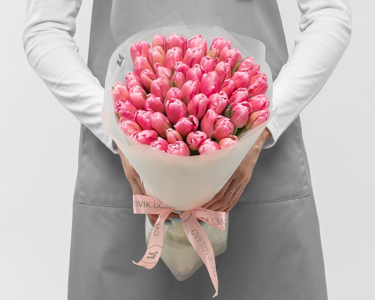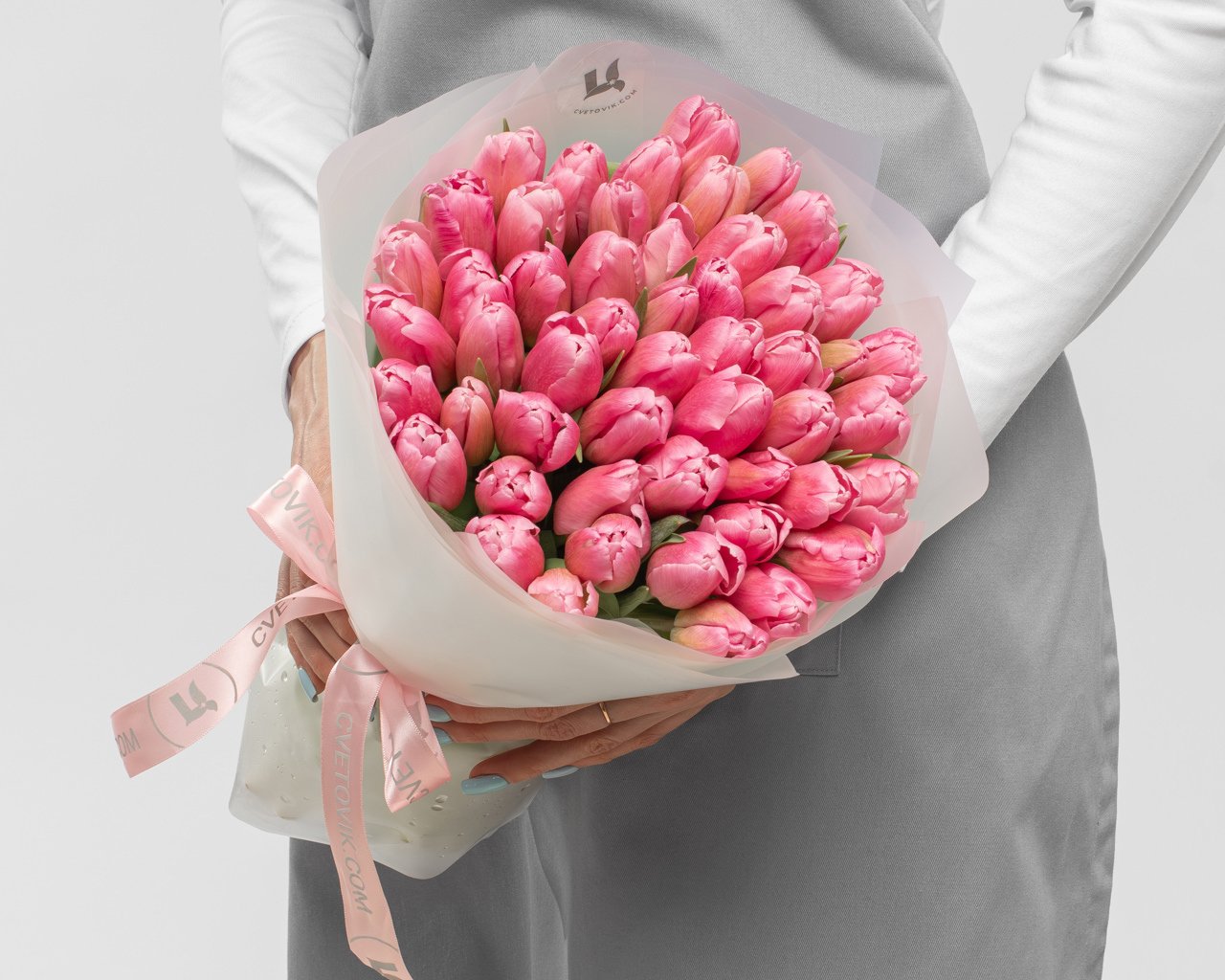 Состав: тюльпан 51 шт, пленка матовая 3 шт, лента атласная 1 шт.