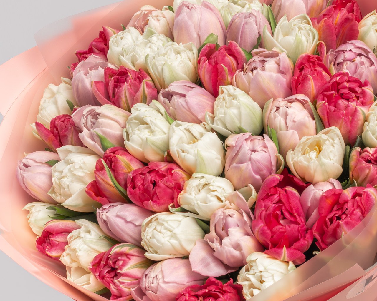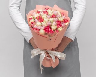 Состав: тюльпан пионовидный 51 шт., пленка 3 шт., лента атласная 1 шт.