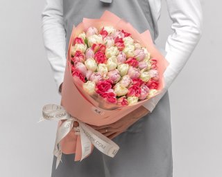 Пышный букет из пионовидных тюльпанов порадует вас своей красотой, мягким ароматом и изысканным сочетанием оттенков.